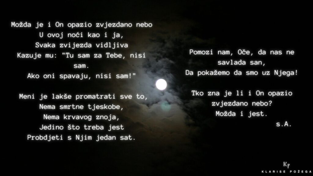 Ovaj tekst govori o posljednjim Isusovim danima, koje je On posvetio molitvi. Isus je znao što ga čeka, znao je da jedino s molitvom može proći kroz sve muke i križ, ali poziva i svoje učenike, poziva i nas na molitvu!